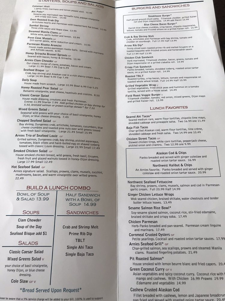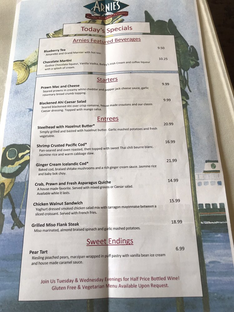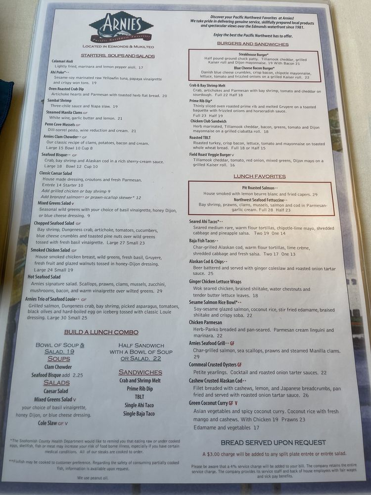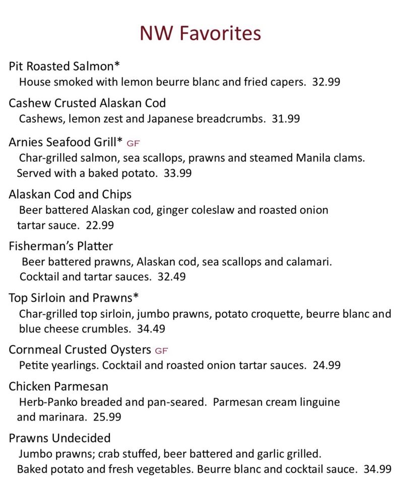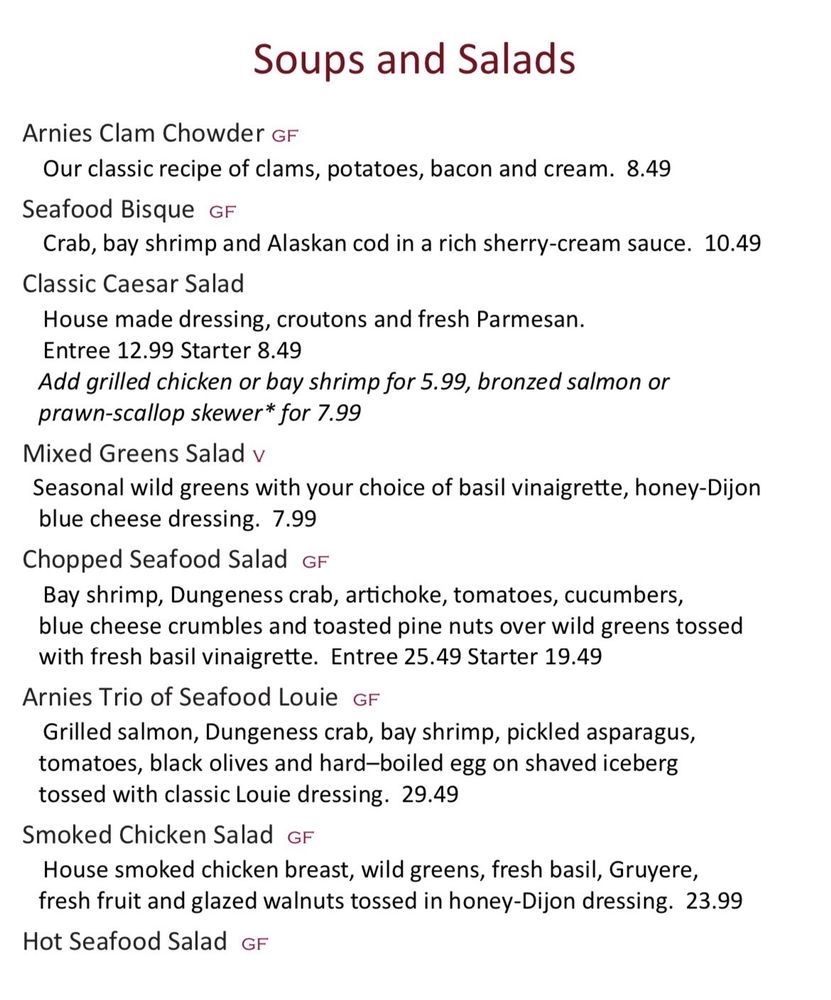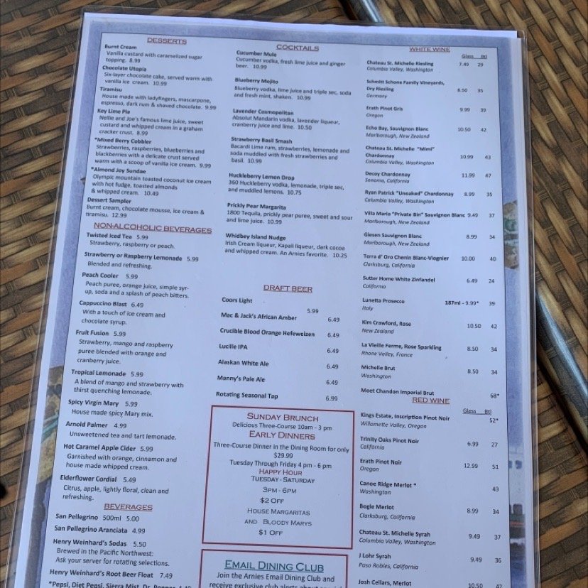 Introducing Arnies Restaurant - Edmonds, a casual dining spot offering a variety of options for different preferences. Located in Edmonds, WA, Arnies provides a pleasant dining experience with its waterfront views. The menu boasts Northwest breakfast favorites like Eggs Benedict and Steak & Eggs, as well as delectable waffles and toasts. Their large salads, such as the Trio of Seafood Louie and Smoked Chicken Salad, showcase a blend of flavors and fresh ingredients. Customer reviews emphasize the restaurant's excellent service and delicious seafood offerings. While some diners appreciate the friendly atmosphere and prompt service, others caution against certain dishes like the seafood chowder. Overall, Arnies Restaurant - Edmonds is a popular choice for those looking for a satisfying meal with a view.